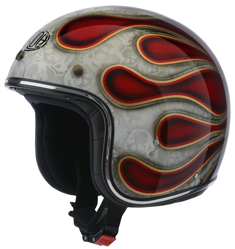 Riot is the proposal dedicated to the vintage style and cafè racer. The shell, made with the new PRE-PREG fibre technology, enables the limiting of weight, ensuring the rider a safe and light ride and reducing fatigue and stress on the neck and shoulders. Riot is also equipped with an approved retractable sun visor, 50% tinted, offering maximum protection from the sun and some accessories can sold separately, such as the long face shield, which covers the face up to the chin, and the peak, applicable thanks to the three buttons on the front part of the shell. Utmost care has been taken within the inner lining, removable and washable, made from fabrics of the latest generation, highly breathable and antibacterial. Completing it all is the practical and manageable micrometric retention system.